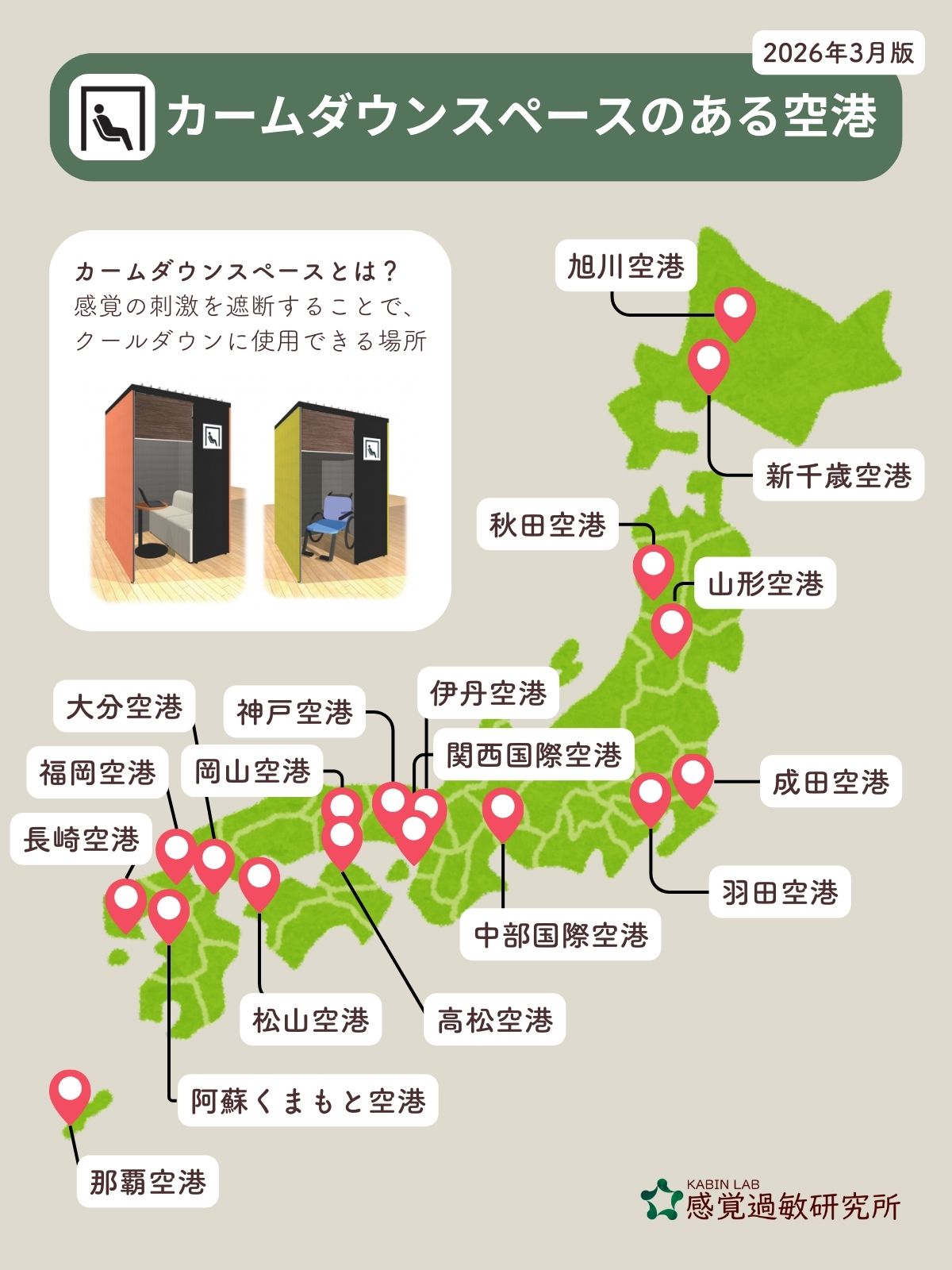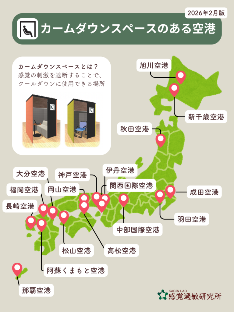 日本全国の空港で、カームダウンスペースの取り組みが広がっています。カームダウン・クールダウンスペースとは、光や音などの感覚の刺激を遮断することで、感覚過敏によるストレスの軽減やパニックの回避やクールダウンに使用できるスペースです。