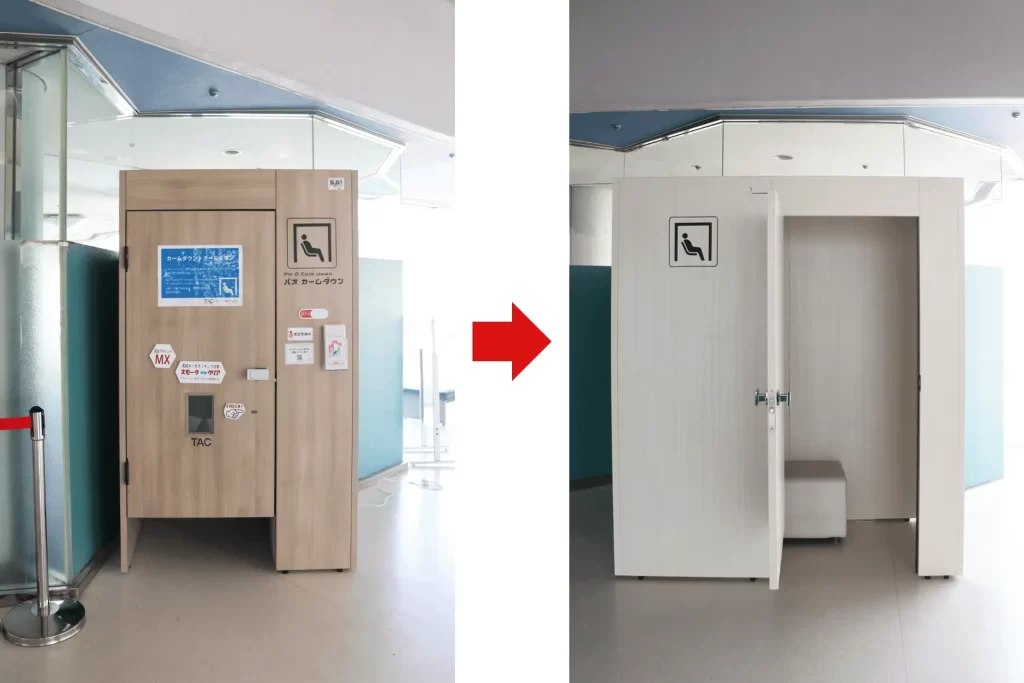 また、カームダウンスペースをそのまま設置するだけでなく、カームダウンスペースの説明や空室表示プレートを取り付けるなど、使いやすさに配慮した工夫がいいなと思いました。