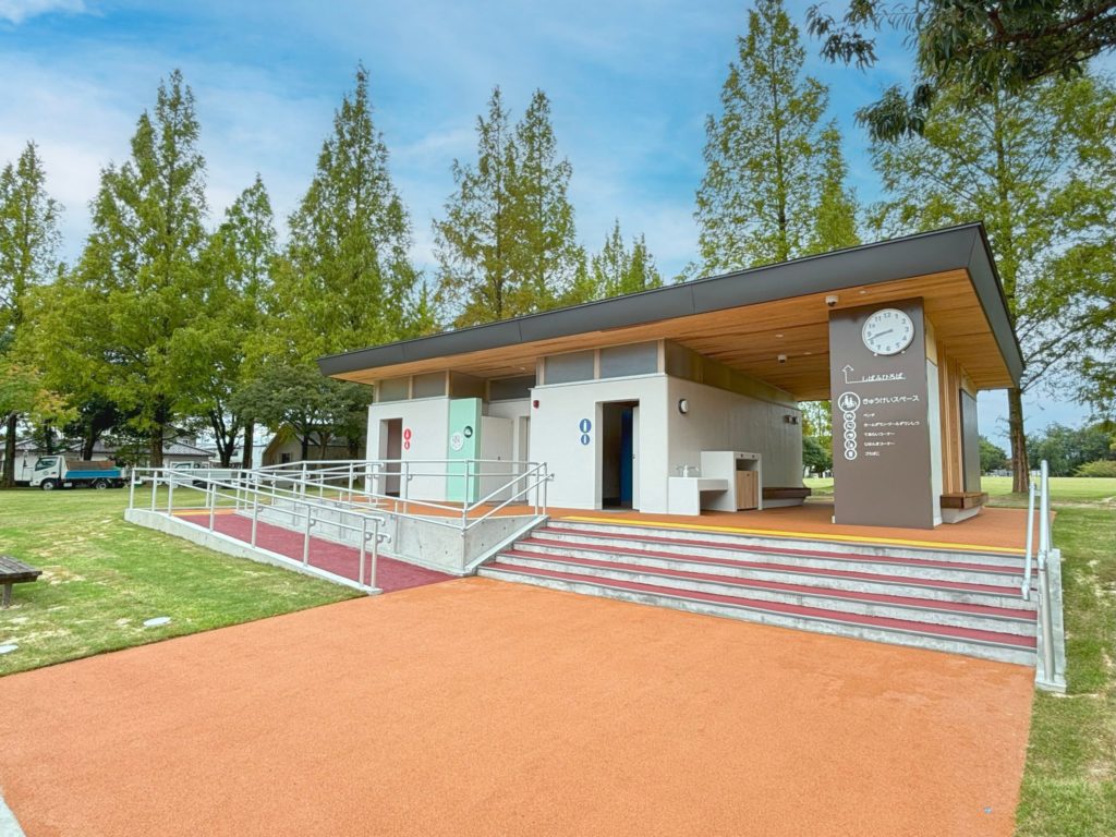 カームダウン・クールダウンスペースは、富山県空港スポーツ緑地の芝生広場とインクルーシブ広場の間にある「すまいるトイレ」に設置されています。