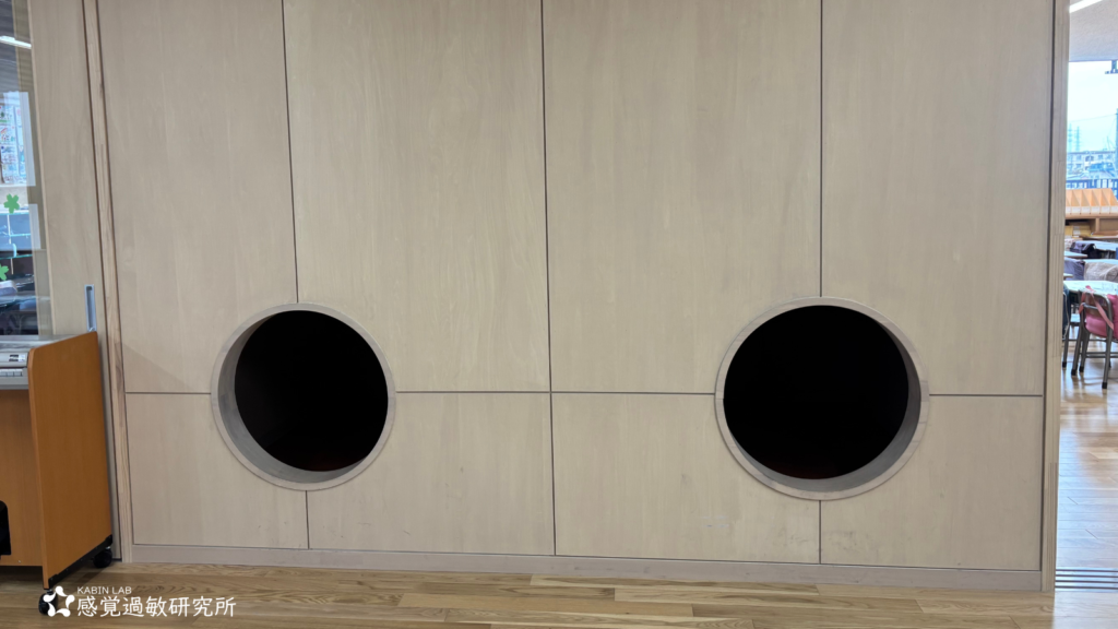 低学年のフロアでは、教室と教室の間に上記のような丸い穴のあいた空間がありました。これがカームダウンスペースなのでしょうか?