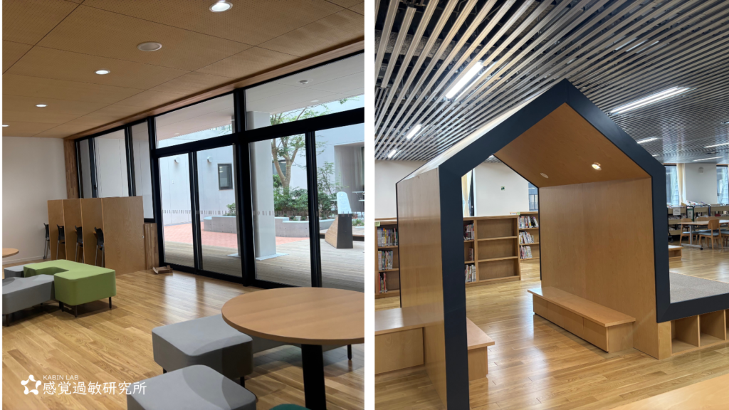 また、校舎内にはカームダウンスペースではありませんが、静かに過ごせる場所が随所に用意されていました。いろいろな場所に落ち着ける場所があるのは素晴らしいです。また、体育館は有孔ボードを壁に使用して音の反響が少ないのも、環境としては素晴らしく、建築設計された方の配慮や思いが感じられる場所がたくさんありました。