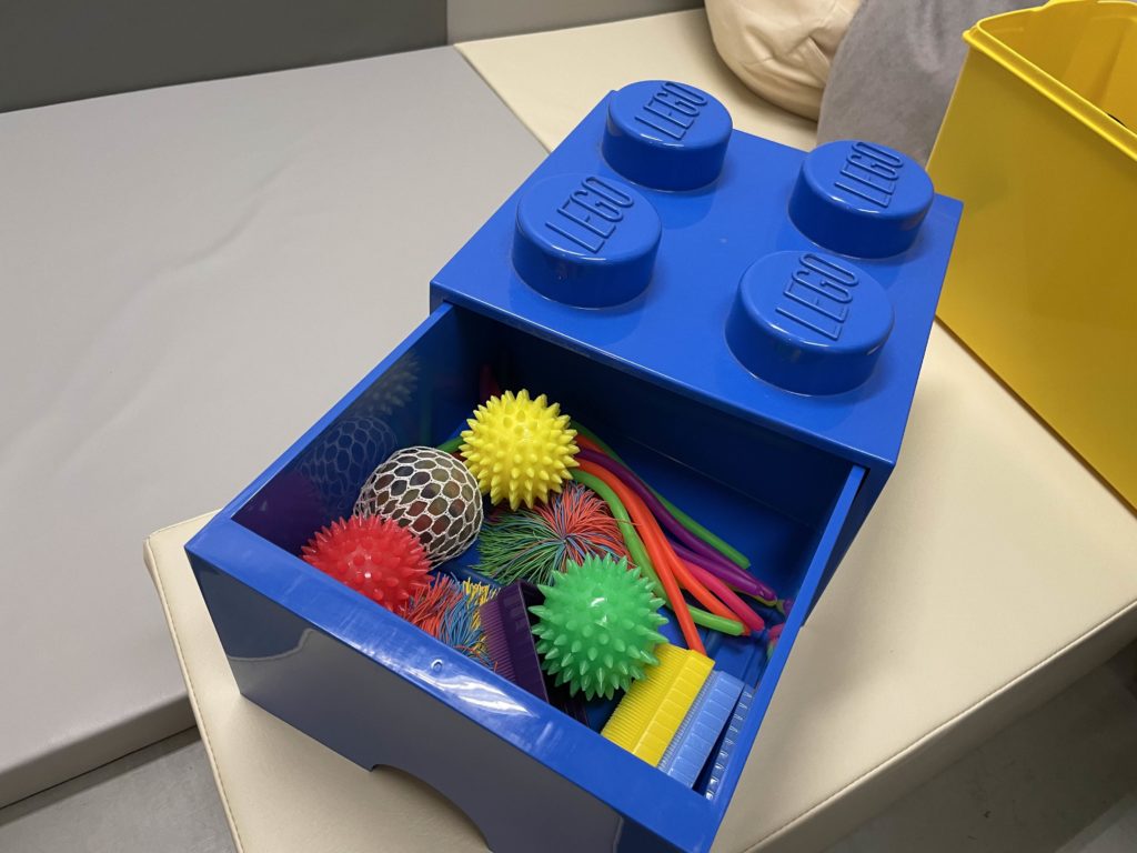 照明の調光もできるので自分が落ち着ける色や明るさに調整できます。さらに、レゴブロックをモチーフにした箱の中には、イヤーマフやセンサリートイが入っていて、自由に使うことができます。