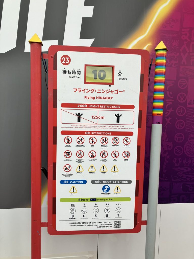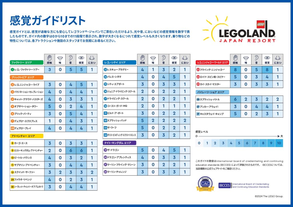 レゴランド・ジャパンにある全アトラクションに、触覚、味覚、聴覚、臭覚、視覚の刺激の強さを、0から10の11段階で示した「感覚ガイド」が設置されています。