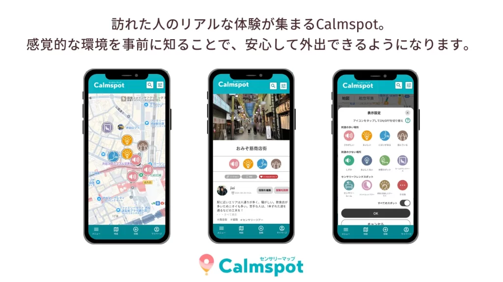 Calmspot(カームスポット)は、音・光・ニオイなどの環境情報や、センサリールーム・カームダウンスペース・静かな場所といった休憩スポットの情報を、口コミ形式で投稿・閲覧できる地図サービスです。なお、Calmspotの実証実験は、トヨタ・モビリティ基金「Mobility for ALL」の支援を受けて実施されています。