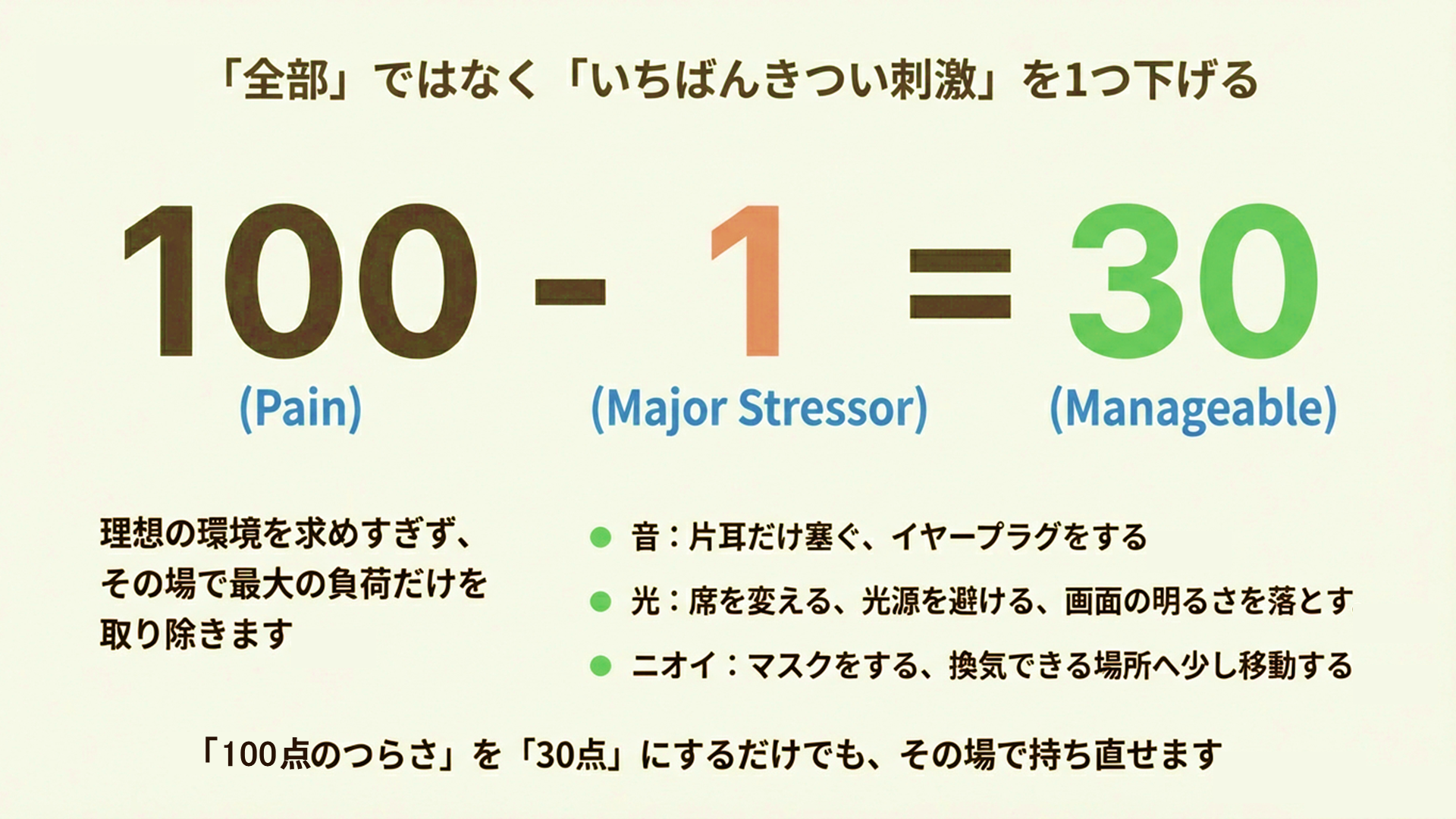 理想の環境を作るのは難しいので、私は「今いちばんきつい刺激」を一つだけ下げます。
