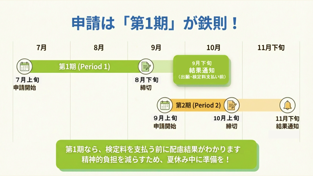 どちらの時期でも申請は可能ですが、第1期で申請した場合は、9月下旬までに審査結果が通知されるため、共通テストの出願期間中に結果を確認できるメリットがあります。