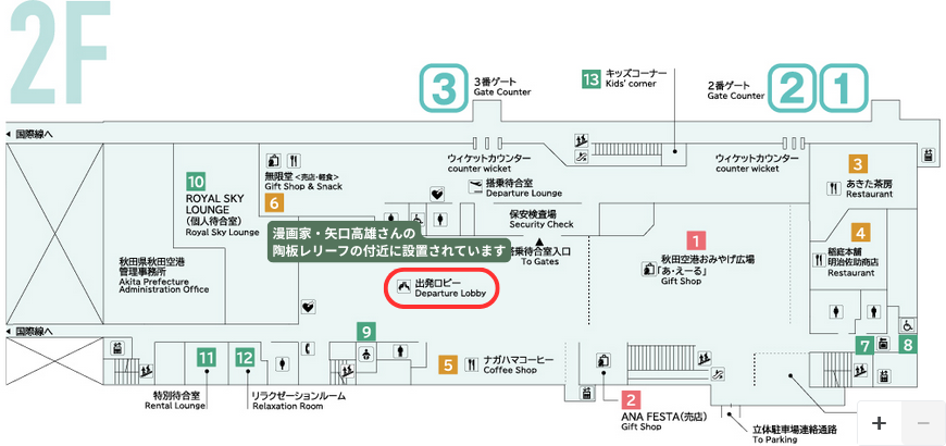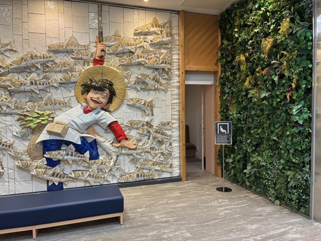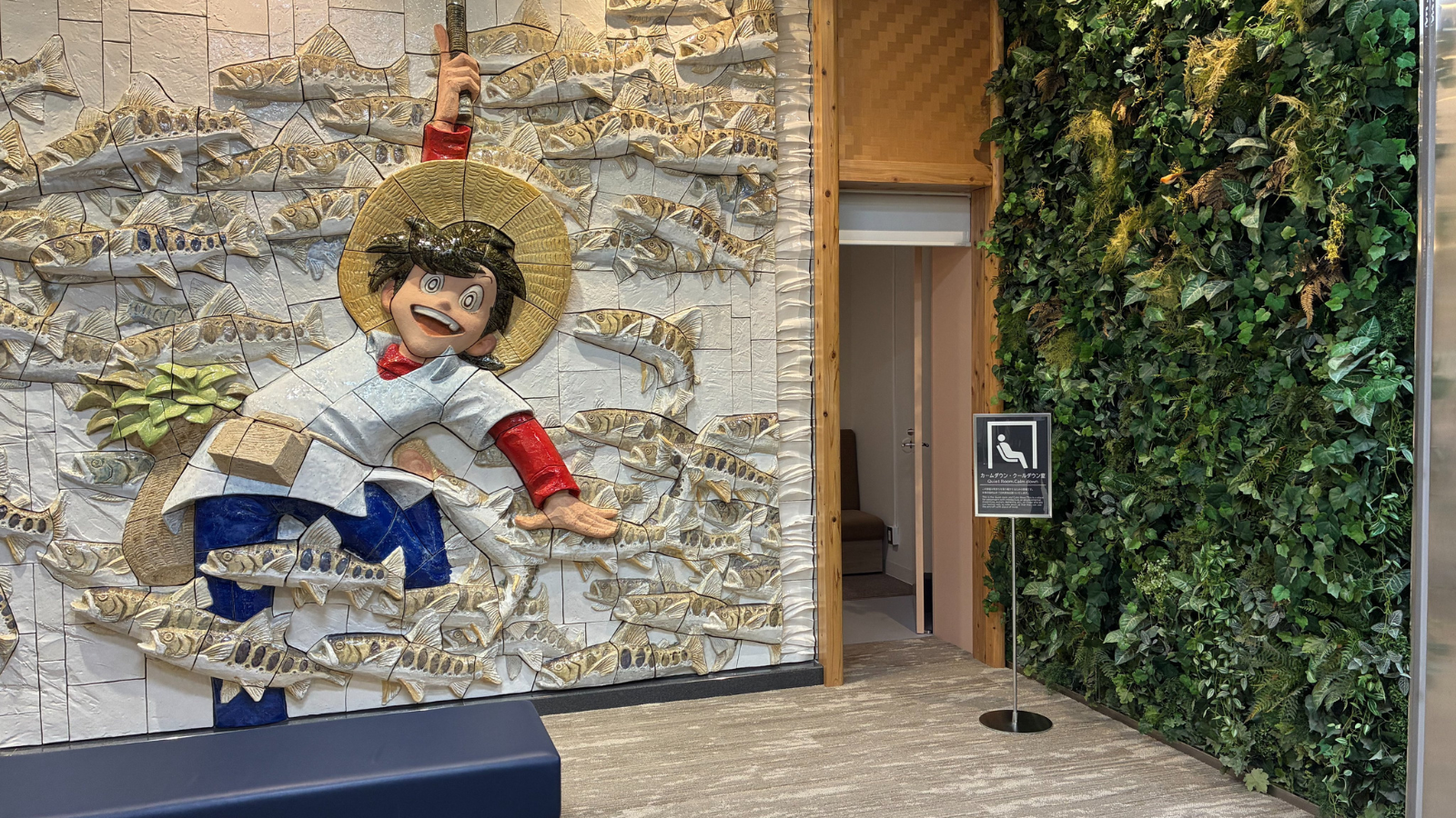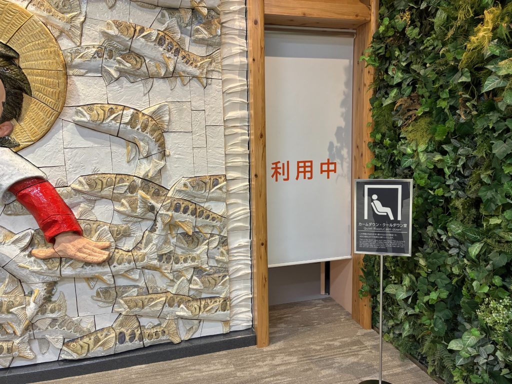 国内線2階出発ロビーにある、漫画家・矢口高雄さんの陶板レリーフの付近に、カームダウン・クールダウンスペースが設置されています。
