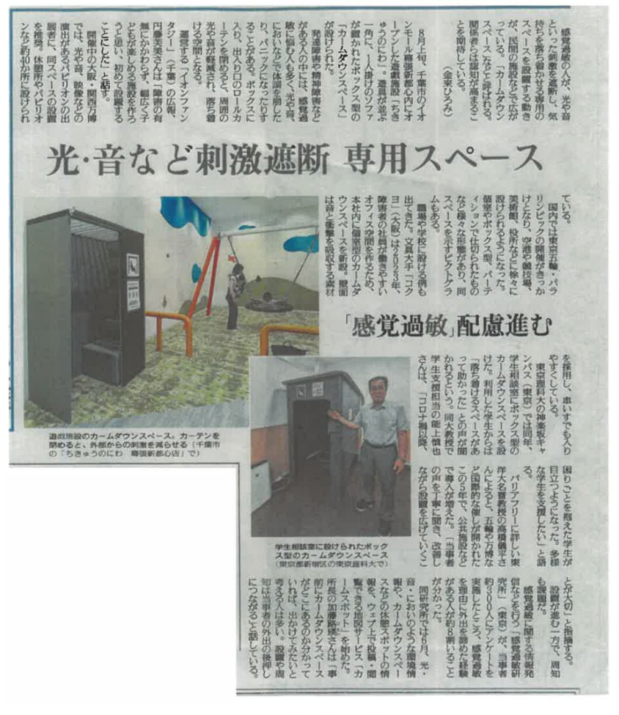 TOP > お知らせ > メディア掲載・出演 > 読売新聞朝刊:カームダウンスペースに関する記事の取材協力をしました 2025年8月28日の読売新聞朝刊に、イオンモール幕張新都心にある「ちきゅうのにわ」など、カームダウンスペースの取り組みが掲載されました。