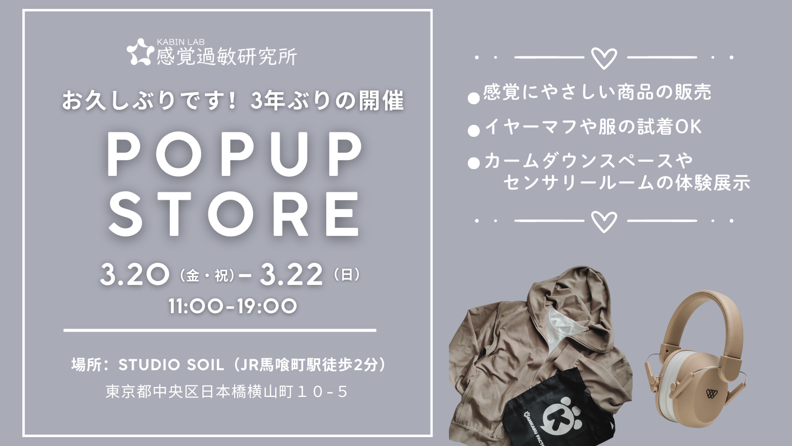 感覚過敏研究所では、3年ぶりとなるポップアップストアを開催します。会期は2026年3月20日(木)から22日(土)まで、会場は東京・馬喰町にあるSTUDIO SOIL(JR馬喰町駅徒歩2分)です。